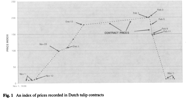 So, the tulip flowers were commonly planted in the fall (Sept – Dec) and dug up in the spring (Mar – June). In this context, the prices as shown in the graph could not possibly be cash contracts, rather contracts for future delivery or futures. As you can see, contract prices rose to new heights until the news that trading was going to be suspended reached the market, resulting in a further fall of prices until the actual trade suspension on February 5th 1637. Now, there were no basic economic shocks over this relatively short span of months, it clearly must be a bubble. The prices do not seem to accrue to fundamental values.